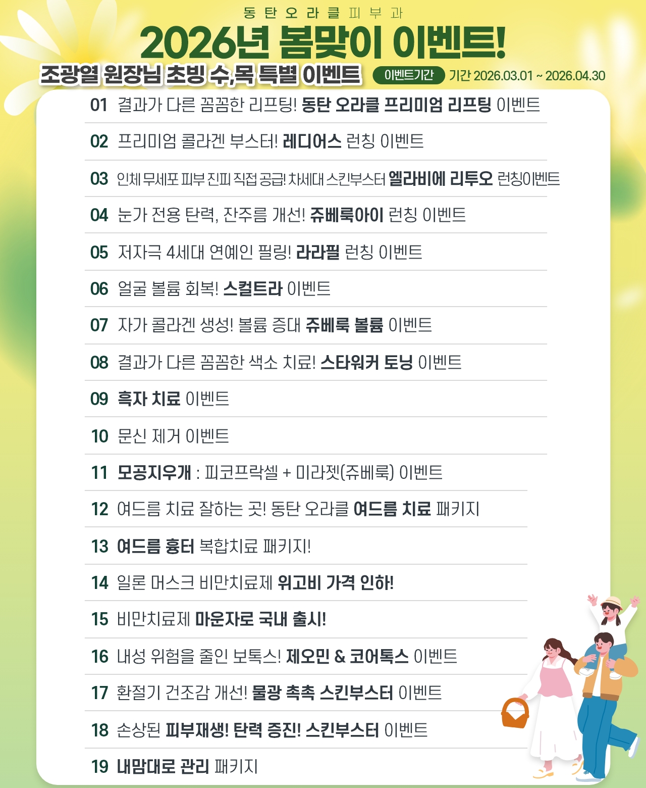 Notice 4월 진료 스케줄 2026.03.03 Event 2026년 봄맞이 이벤트! 2026.02.27 Notice 3월 진료스케줄 2026.02.05 Event 2026년 새해 신년맞이 이벤트! 2025.12.26 Event 2025년 11~12월 이벤트 2025.10.27