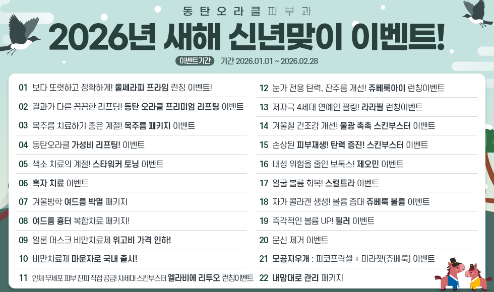 Notice 2월 진료 스케줄 2026.01.02 Event 2026년 새해 신년맞이 이벤트! 2025.12.26 Notice 1월 진료 스케쥴 2025.12.02 Event 2025년 11~12월 이벤트 2025.10.27 Event 2025년 9~10월 이벤트 2025.08.28