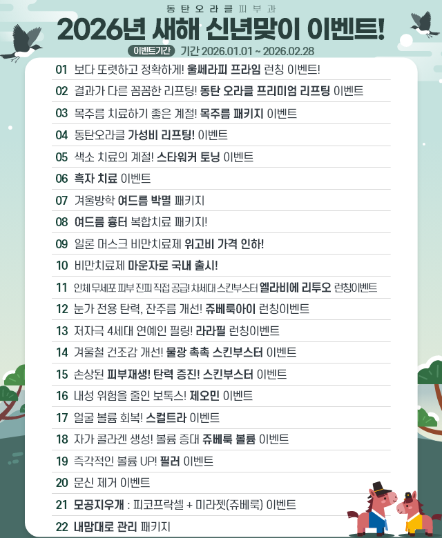 Notice 3월 진료스케줄 2026.02.05 Notice 2월 진료 스케줄 2026.01.02 Event 2026년 새해 신년맞이 이벤트! 2025.12.26 Event 2025년 11~12월 이벤트 2025.10.27 Event 2025년 9~10월 이벤트 2025.08.28