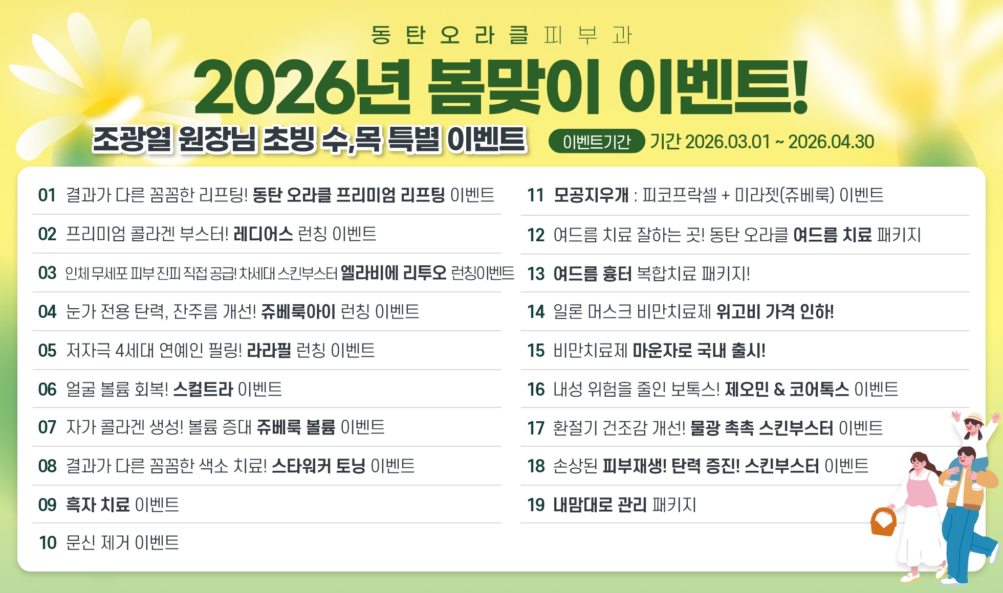 Notice 4월 진료 스케줄 2026.03.03 Event 2026년 봄맞이 이벤트! 2026.02.27 Notice 3월 진료스케줄 2026.02.05 Event 2026년 새해 신년맞이 이벤트! 2025.12.26 Event 2025년 11~12월 이벤트 2025.10.27